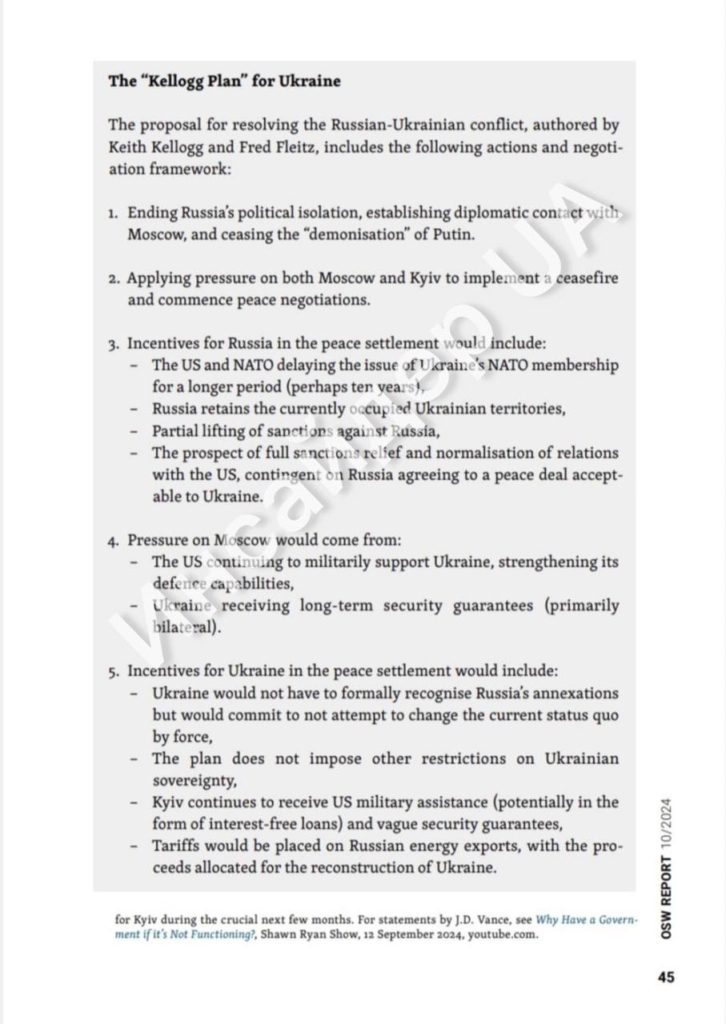 Свой «мирный» план Келлог составил еще в апреле 2024 года, однако он стал особо актуален после его недавнего назначения Трампом на пост специального посланника США по Украине. Основные положения плана следующие: