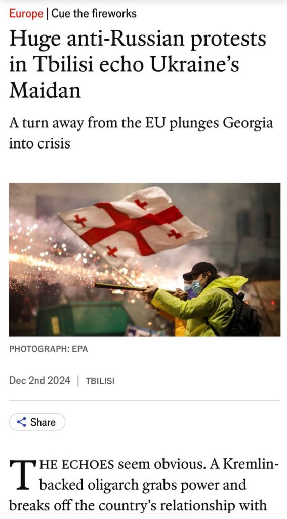 «Масштабные антироссийские протесты в Тбилиси перекликаются с украинским майданом», — пишет британский журнал The Economist.