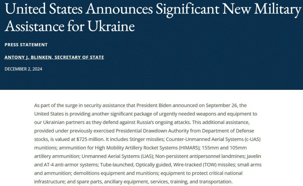 Соединенные Штаты отправят на Украину сотни тысяч дополнительных артиллерийских снарядов, тысячи ракет и других критически важных средств до середины января.