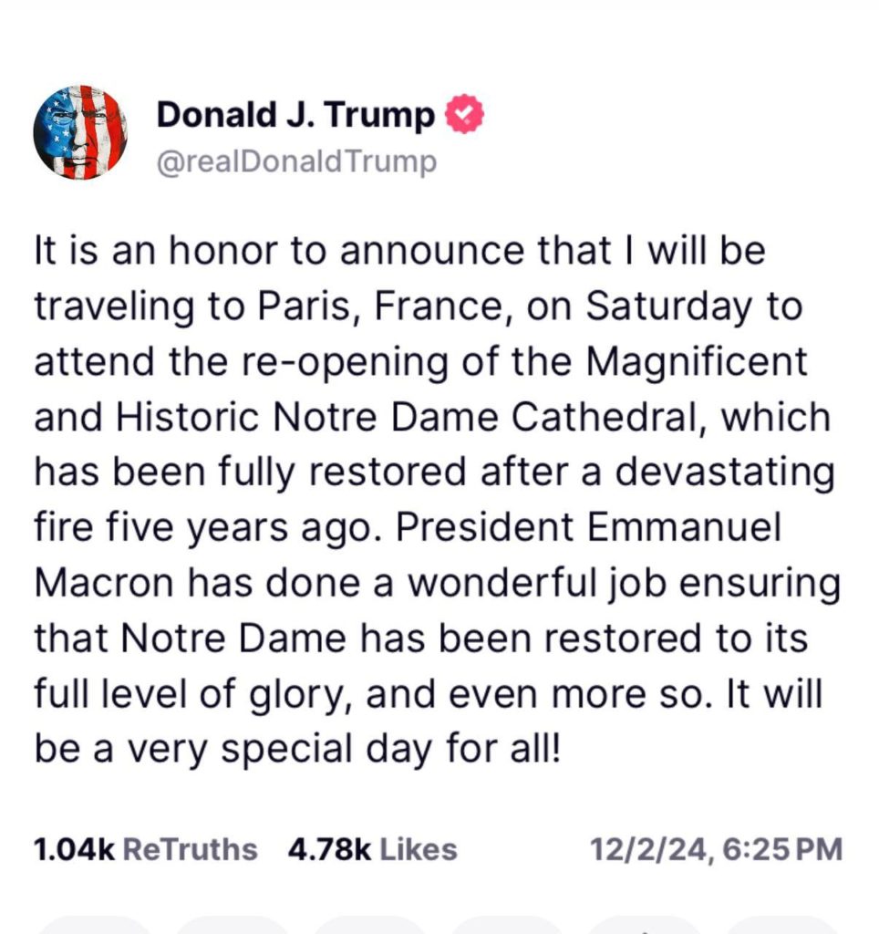 «Для меня большая честь сообщить, что в субботу я отправлюсь в Париж, Франция, чтобы присутствовать на открытии величественного и исторического собора Парижской Богоматери, который был полностью восстановлен после разрушительного пожара пять лет назад», – написал он в соцсетях.