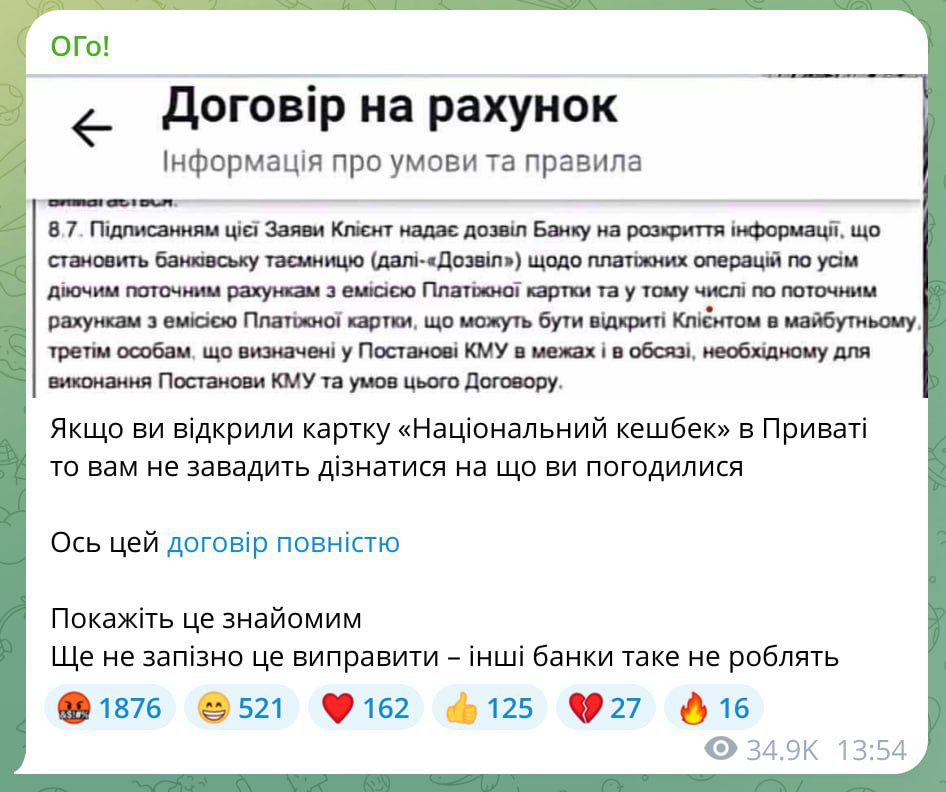 Сооснователь украинского «Монобанка» Олег Гороховский обратил внимание пользователей, что, якобы при оформлении карты «Национальный кэшбек» в «Приватбанке» клиент подписывает договор, по которому он соглашается на раскрытие банковской тайны и предоставление информации о своих платежах.
