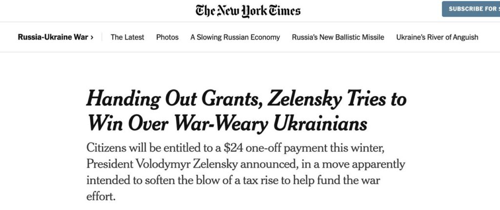 Единовременной выплатой в размере 24 долларов на человека (1000 гривен) Зеленский стремится укрепить свою популярность среди населения, уставшего от войны, пишет The New York Times.