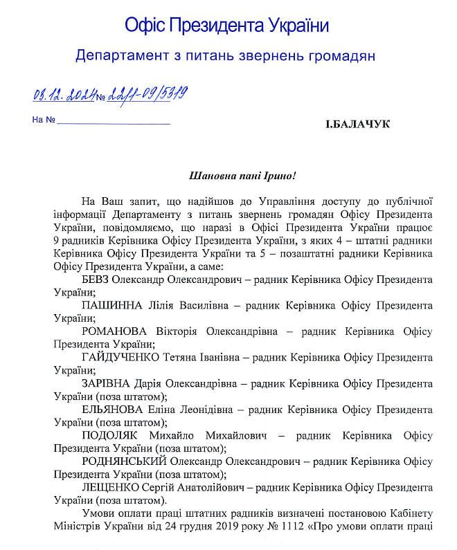 «Сейчас в Офисе президента работает 9 советников руководителя Офиса президента, из которых 4 штатных советника и 5 внештатных советников», — говорится в ответе и приводится список людей.