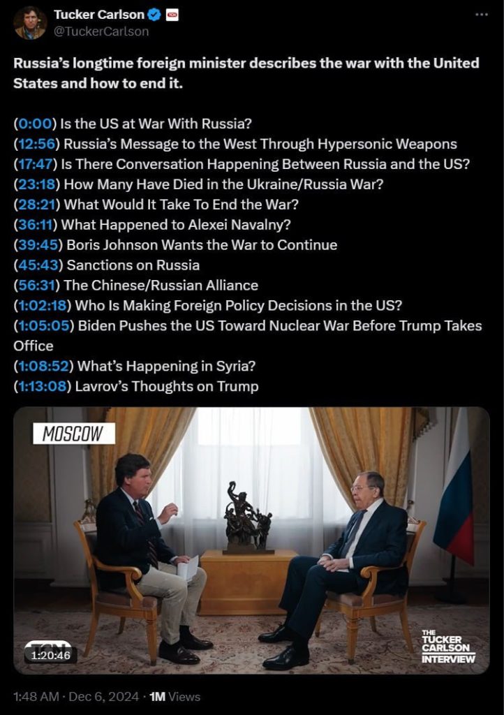 Публикацию американского журналиста Такера Карлсона в соцсети Х*, к которой он прикрепил полную видеоверсию интервью с главой МИД РФ Сергеем Лавровым, в первые десять минут просмотрели 100 тысяч пользователей.