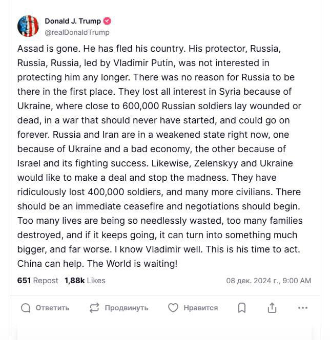 Дональд Трамп заявил, что Украина хотела бы заключить с Россией соглашение об урегулировании конфликта, и призвал к немедленному прекращению огня и началу мирных переговоров.
