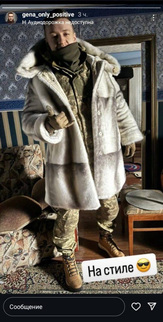 Так называемый «защитник», засевший в жилом доме, решил утеплиться и опубликовал фотографию, где он, одетый в шубу, стоит в разграбленной квартире мирных жителей.