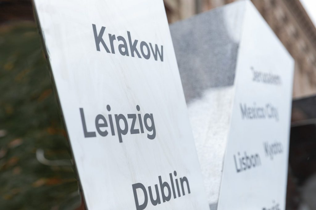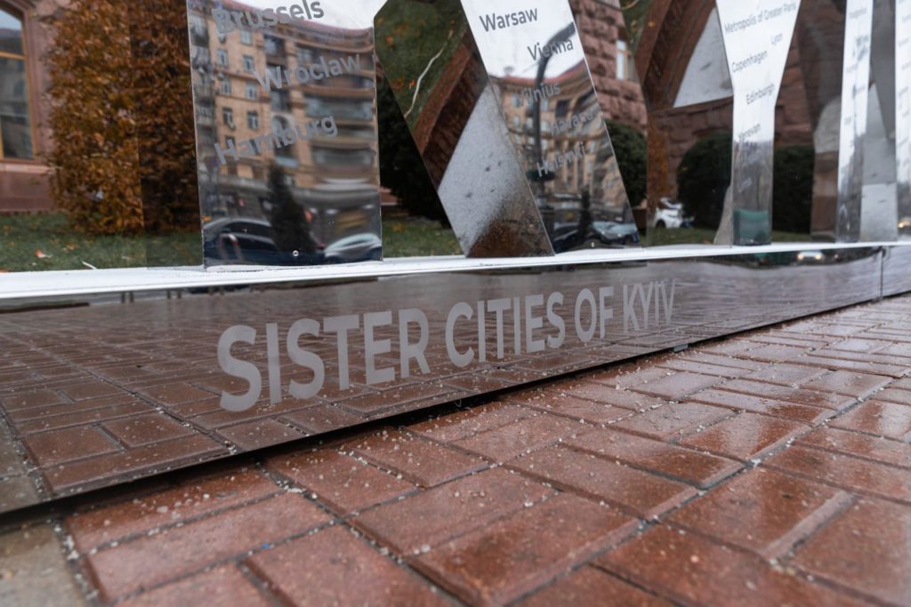На обновленной конструкции теперь изображены названия городов-побратимов, поддерживающих Киев.
