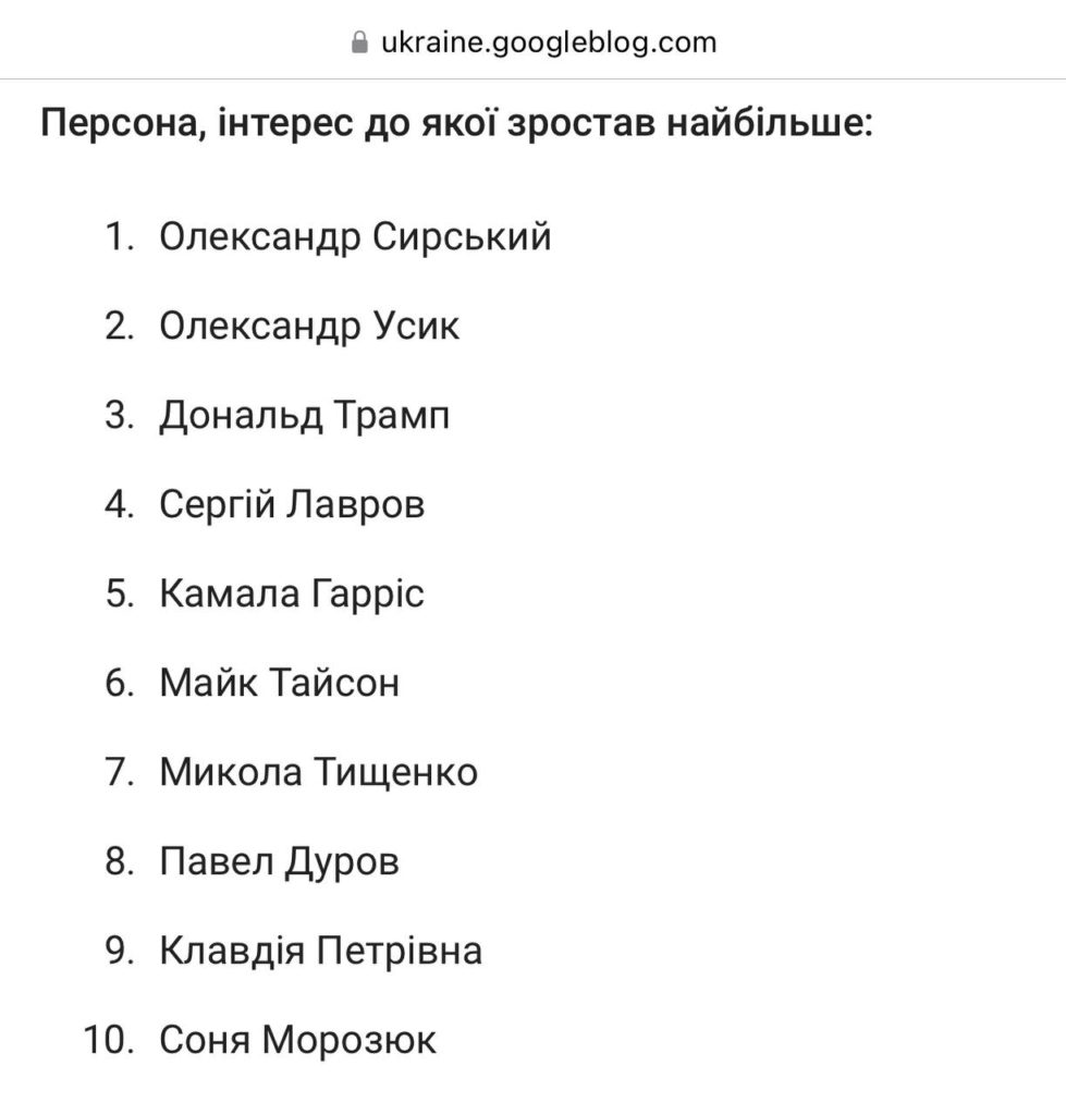 Среди того, что чаще всего искали украинцы, первую позицию занял запрос «График отключения света». В категории персон лидером стал Главнокомандующий ВСУ Александр Сырский. Среди топ-10 лиц, интерес к которым рос больше всего в течение года, только один представитель мира политики — депутат ВРУ Николай Тищенко. Он известен тем, что участвовал в драке с бойцом националистического батальона «Кракен».