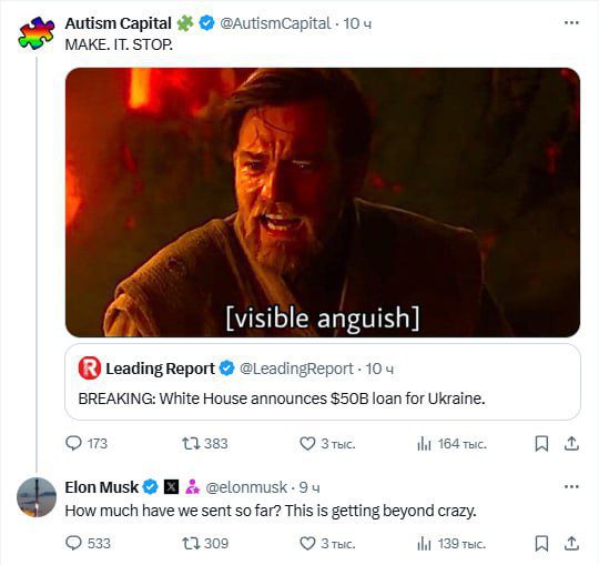 Пользователь соцсети Х* с никнеймом Autism Capital после сообщения о выделении администрацией Байдена 50 миллиардов долларов Украине написал: «Остановите это».