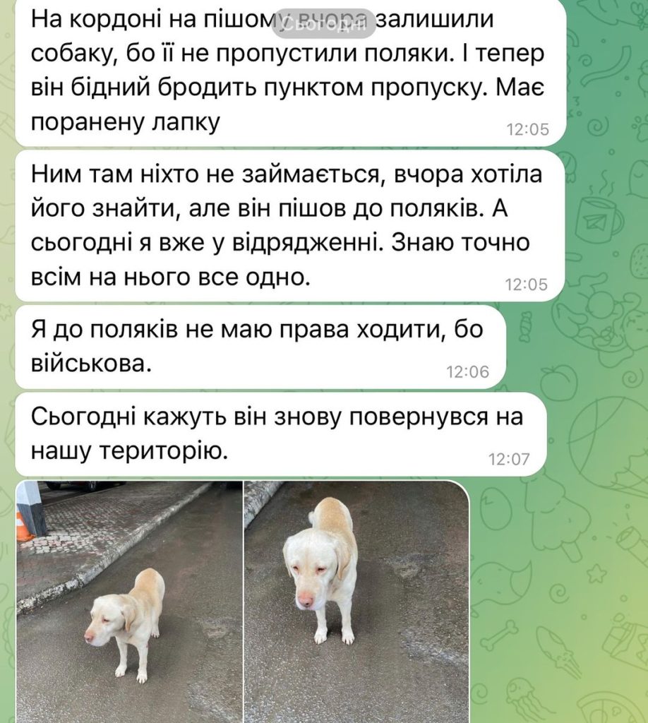 Лабрадор был вынужден двое суток блуждать между украинской и польской территорией. У него была ранена лапа. Позже для него все-таки нашли временную передержку.