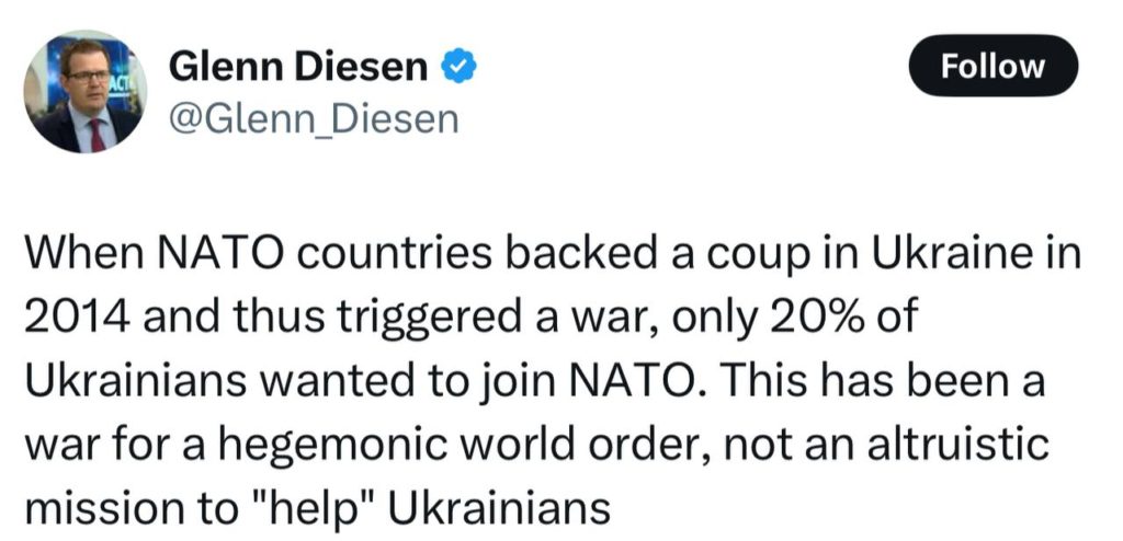 Дизен напомнил, что в 2014 году, когда Запад поддержал государственный переворот на Украине, запустив процесс дестабилизации в стране, лишь 20% украинцев высказывались за вступление в НАТО.