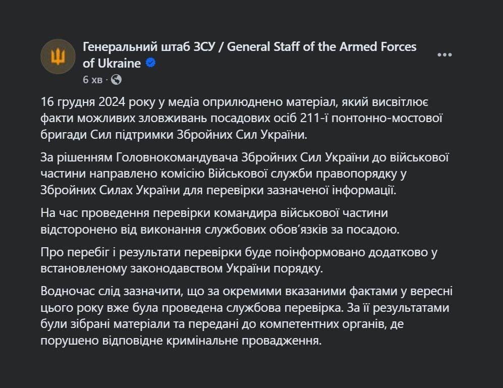 Главнокомандующий ВСУ Александр Сырский отстранил командира 211 понтонно-мостовой бригады Сил поддержки ВСУ после разразившегося в СМИ скандала, связанного с истязаниями и поборами в подразделении.