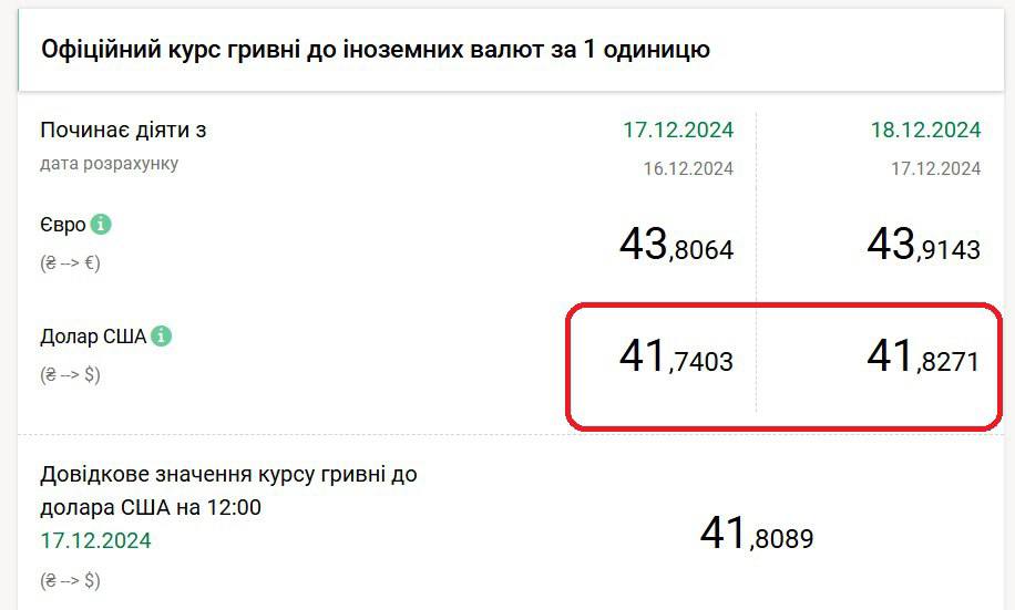 За две недели до конца года Национальный банк ускорил девальвацию гривны. За последние два дня она снизилась на 16 копеек (около 40 российских копеек). 17 декабря НБУ установил новый официальный максимум курса гривны к доллару — 41,83 гривны (103,2 рубля) за доллар. Это выше, чем показатель прошлой недели, который составлял 41,66 гривны (102,8 рубля) за доллар.