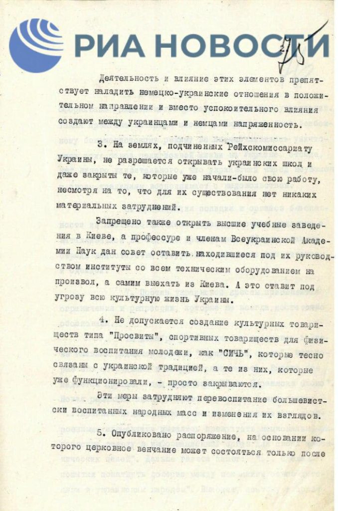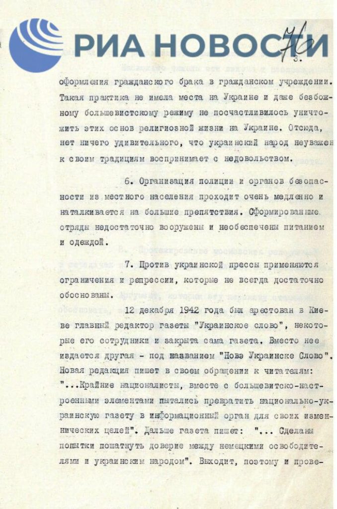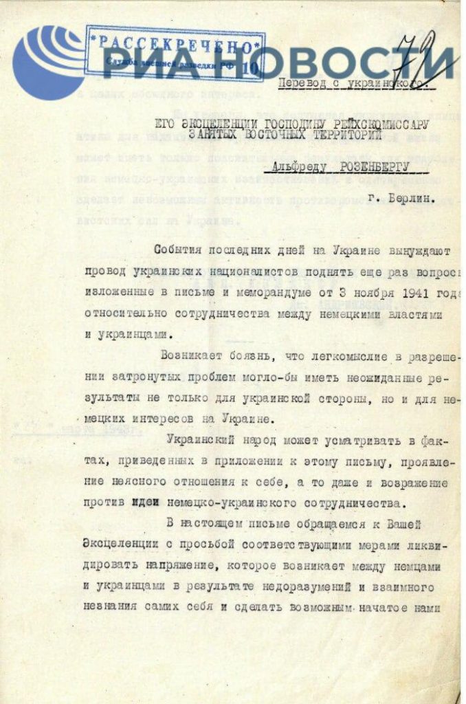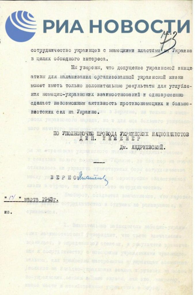 Агентство публикует письмо уполномоченного Провода украинских националистов Дмитрия Андриевского рейхсминистру восточных оккупированных территорий Альфреду Розенбергу «о трудностях, возникающих при сотрудничестве между немецкими оккупационными властями и украинцами».