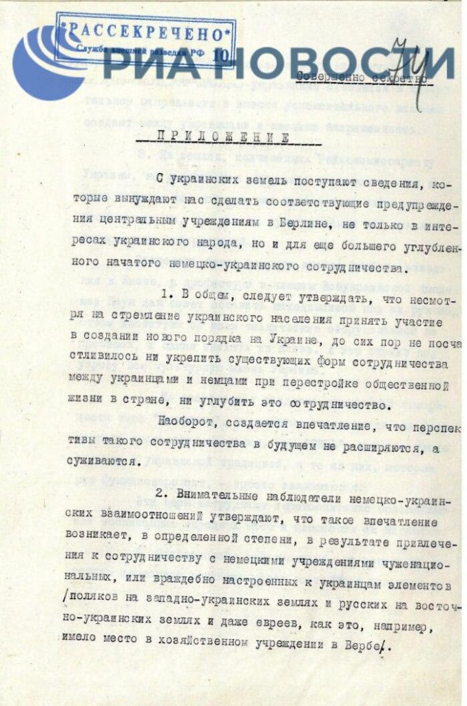 Эксперт провел параллели между сегодняшним положением Киева и поведением верхушки украинских националистов 83 года назад. Эти данные взяты из архива СВР, опубликованном на сайте Президентской библиотеки.