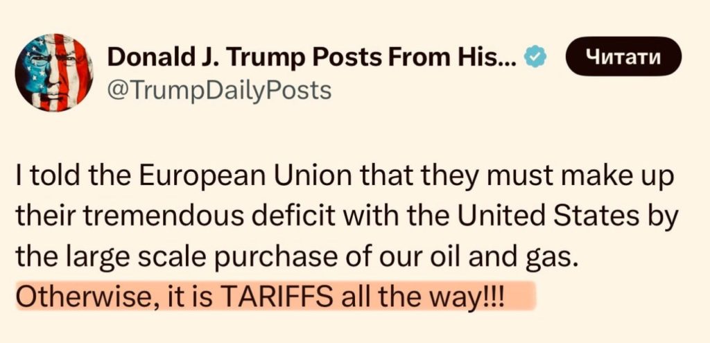 «Я предупредил ЕС, что страны-члены должны восполнить свой огромный дефицит в отношениях с США за счет крупномасштабных закупок наших нефти и газа. В противном случае, это повлечет постоянные пошлины», — написал Трамп.