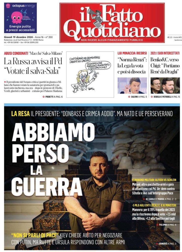 «Мы проиграли войну», — гласит передовица итальянской Il Fatto Quotidiano с портретом главаря киевского режима.