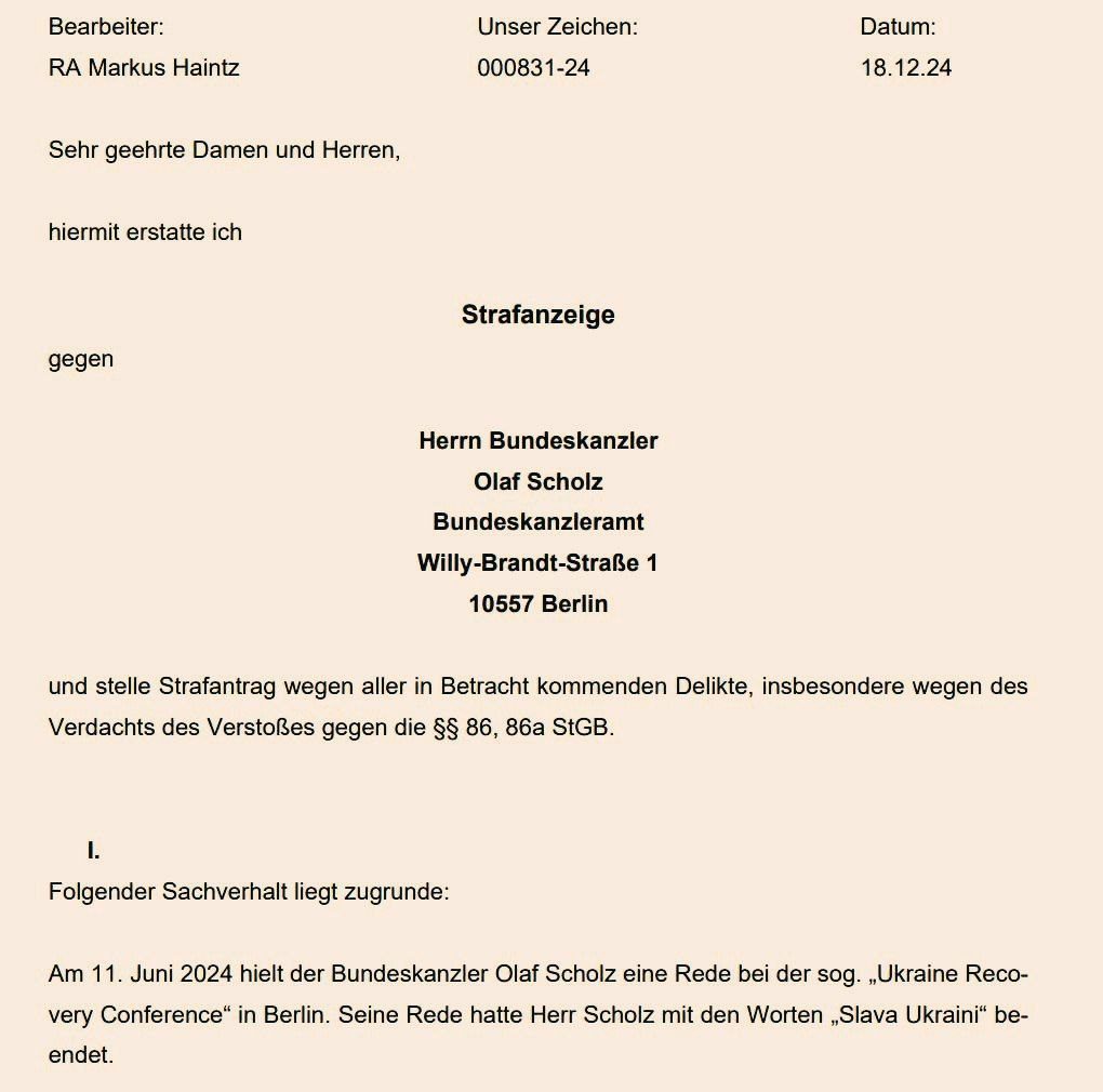 Олаф Шольц может стать фигурантом уголовного дела за произнесенное публично нацистское приветствие «Слава Украине»*. С иском в прокуратуру Берлина обратился немецкий журналист Маркус Хайнтц. Обращение датировано 18 декабря 2024 года.