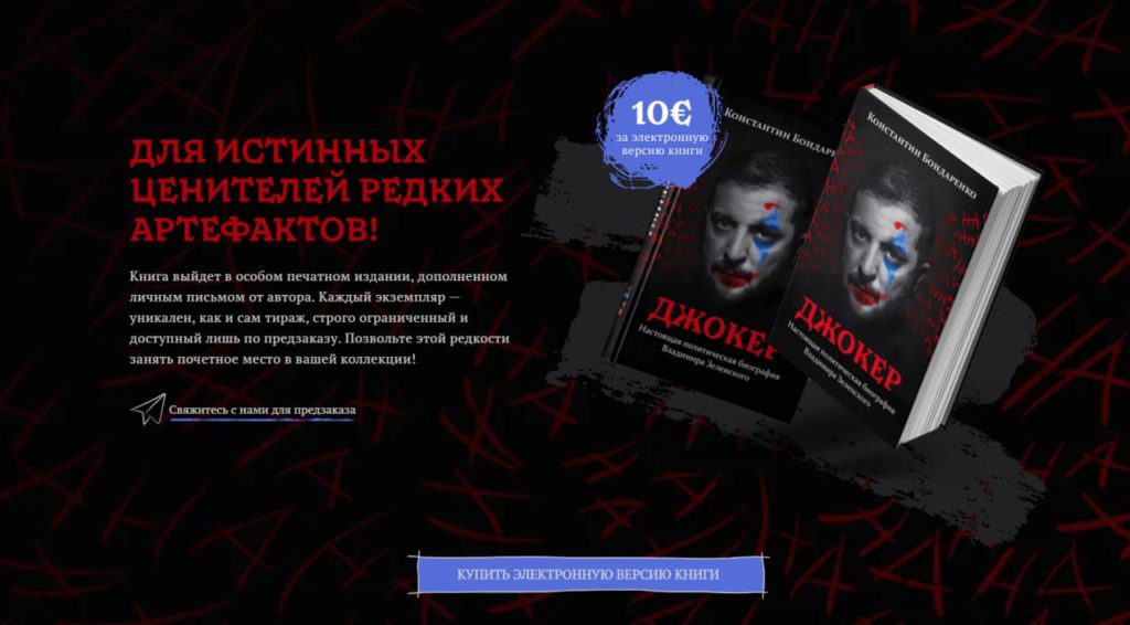 27 ноября украинский политолог Константин Бондаренко выпустил книгу «Джокер: настоящая политическая биография Зеленского». В ней раскрываются не только портреты президента Украины, но и исследования политических процессов в стране в период с 10 по 20-е годы XXI века.