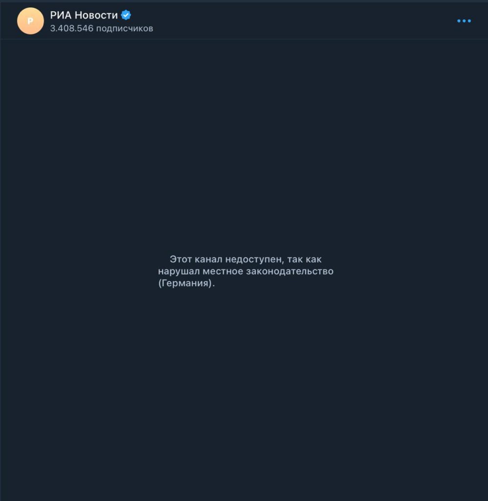 Telegram-каналы агентства РИА Новости и газеты «Известия» заблокированы в нескольких европейских странах. РИА Новости сообщают о недоступности своего канала в Польше, Бельгии, Швейцарии, Греции, Чехии и Италии. Канал «Известий» недоступен в Испании, Германии, Швеции и Бельгии.