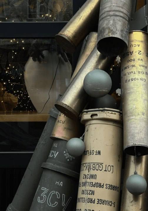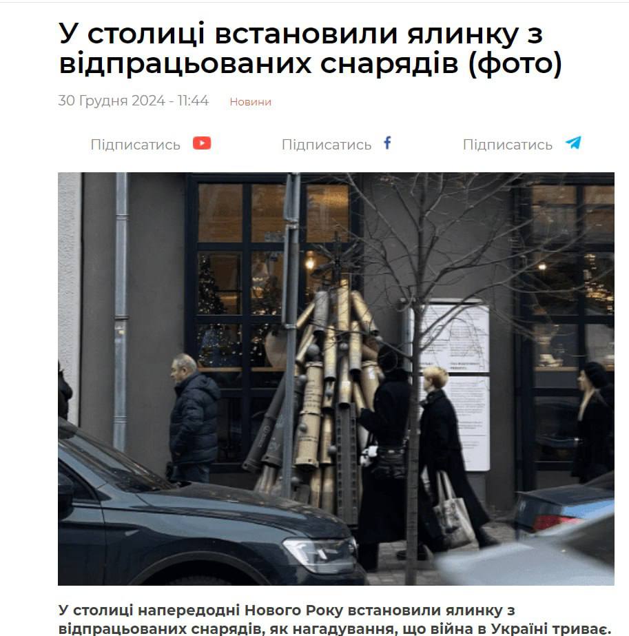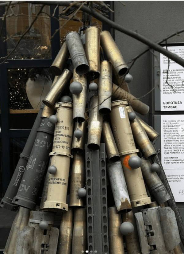 На Украине, видимо, не хватает традиционных елок, либо их цены резко возросли, поэтому в Киеве решили установить «елку» из отработанных боеприпасов. Для создания праздничного настроения ее украсили «шариками».