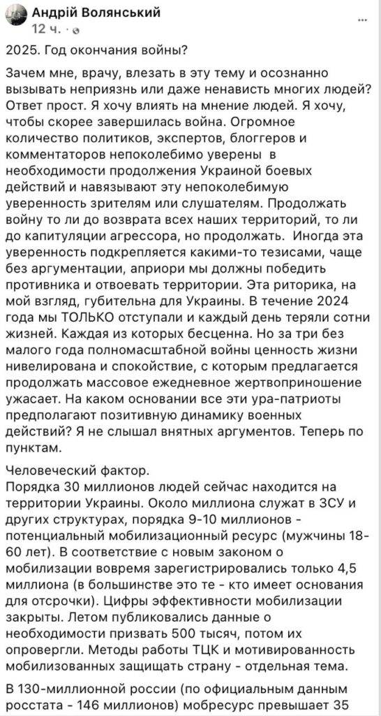 Он утверждает, что его страшит циничное спокойствие, с которым некоторые политики, эксперты, блогеры и комментаторы призывается продолжать боевые действия. При этом в 2024 году ВСУ лишь отступали и «каждый день теряли сотни жизней», отмечает врач.