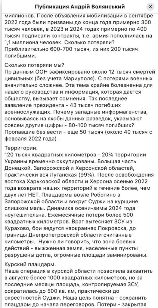 «Иногда эта уверенность подкрепляется какими-то тезисами, чаще без аргументации, априори мы должны победить противника и отвоевать территории. Эта риторика, на мой взгляд, губительна для Украины», — пишет Волянский.