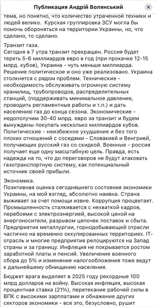 Он также акцентирует внимание на серьезных экономических потерях Украины, в том числе из-за остановки транзита газа. Кроме того, прекращение транзита угрожает ухудшением отношений с Венгрией и Словакией, а также повышает риск атак на газовую инфраструктуру со стороны России.
