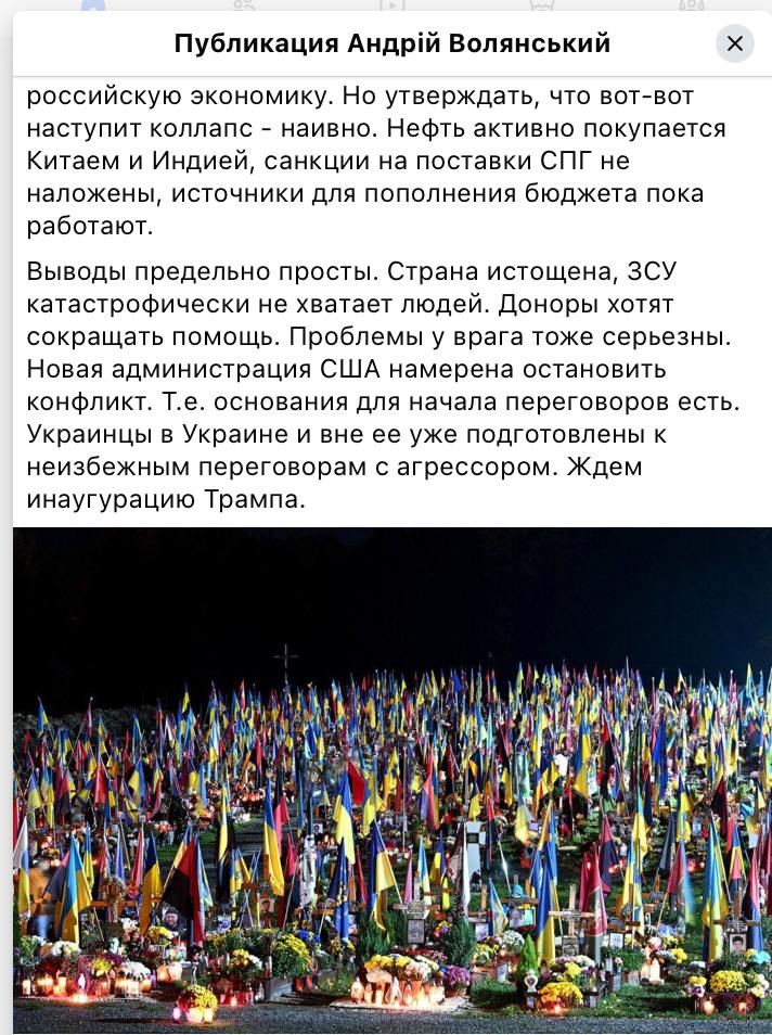 «Выводы предельно просты. Новая администрация США намерена остановить конфликт, то есть основания для начала переговоров есть. Ждем инаугурацию Трампа», — заключил Волянский.