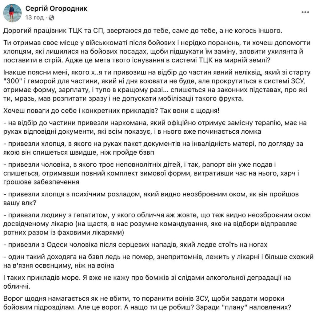 Командир роты 78-го полка Сергей Огородник в открытом обращении к ТЦК резко раскритиковал процесс мобилизации, заявив, что в воинские части направляются люди, физически и психологически не готовые к службе.