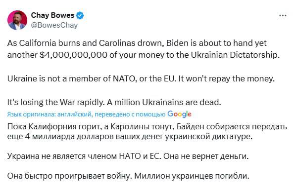 «Пока Калифорния горит, а обе Каролины тонут, Байден собирается передать ещё $4 млрд украинской диктатуре», — пишет ирландский журналист Чей Боуз.