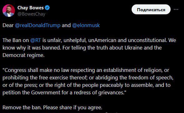 «Дорогие Дональд Трамп и Илон Маск, блокировка RT нечестна, бесполезна, неконституционна, и это не по-американски. Мы знаем, почему он был заблокирован. За передачу правды об Украине и режиме демократов. Снимите запрет», — написал Боуз на своей странице в соцсети.