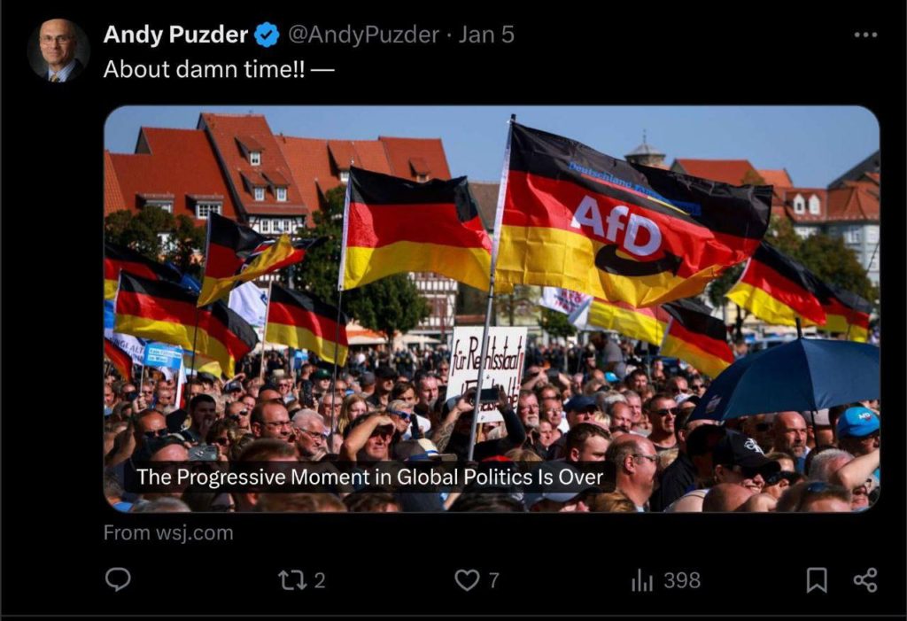 Наибольшее удовольствие от визита нового представителя США в ЕС, безусловно, испытает Шольц, ведь Эндрю Пуцдер с удовольствием делится фотографиями, на которых обычные люди с радостью машут немецкими флагами.