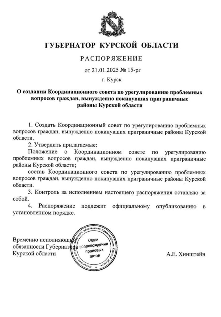 Врио губернатора региона Александр Хинштейн сообщил о создании координационного совета, который будет заниматься решением проблем жителей приграничных районов Курской области.