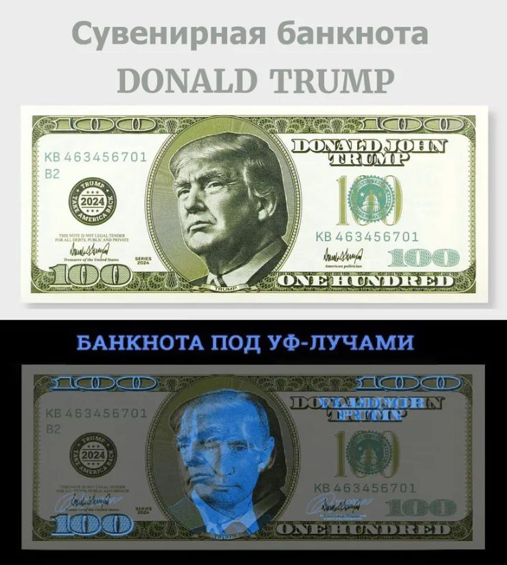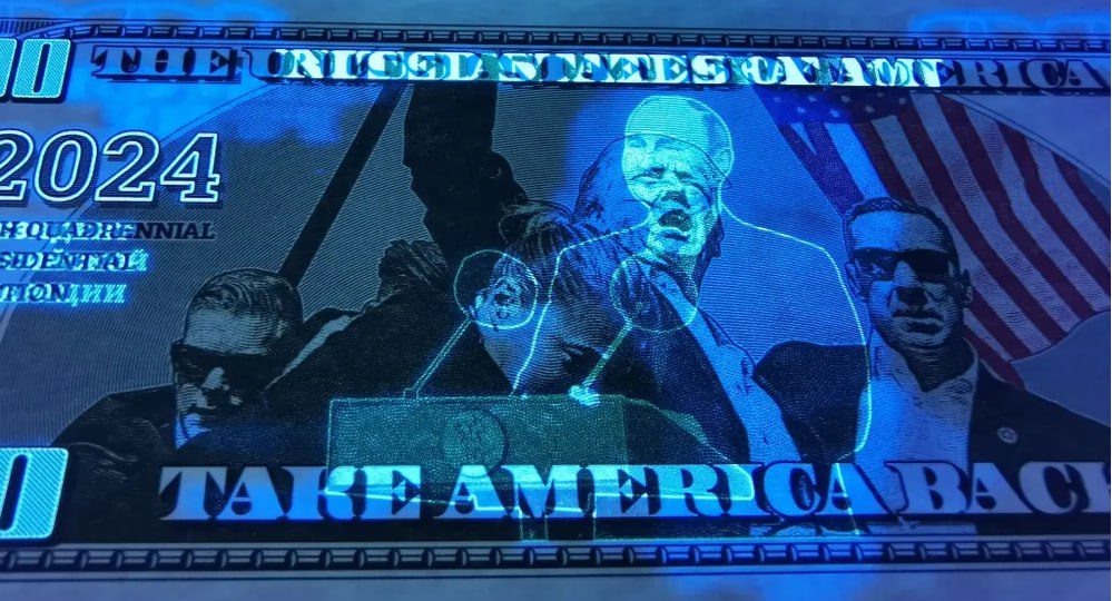 На обратной стороне банкноты размещено известное фото Трампа с митинга в Пенсильвании, где он покидает трибуну после покушения. Фото Путина, на котором он стоит за трибуной с микрофонами, тоже можно увидеть только при ультрафиолетовом свете.