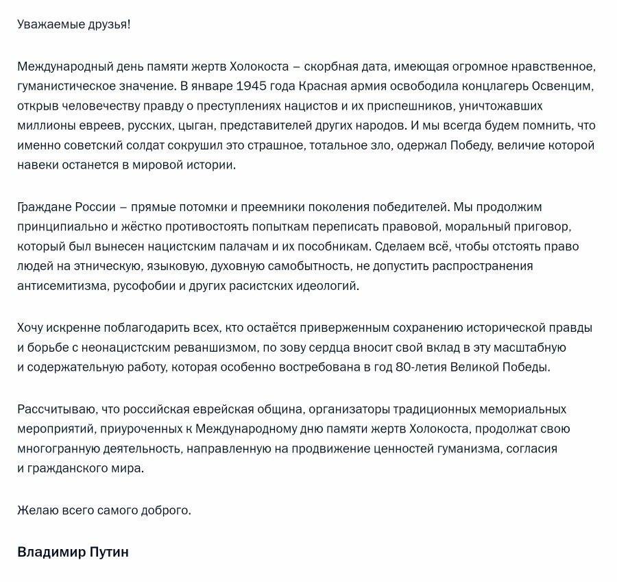 «Международный день памяти жертв Холокоста — скорбная дата, имеющая огромное нравственное, гуманистическое значение. В январе 1945 года Красная армия освободила концлагерь Освенцим, открыв человечеству правду о преступлениях нацистов и их приспешников, уничтожавших миллионы евреев, русских, цыган, представителей других народов. И мы всегда будем помнить, что именно советский солдат сокрушил это страшное, тотальное зло, одержал Победу, величие которой навеки останется в мировой истории», — отметил Владимир Путин.