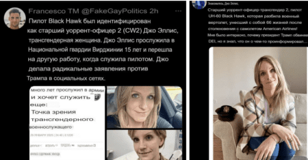 Вертолетом, который влетел в пассажирский самолет в Вашингтоне, управлял трансгендер* Джо Эллис, вероятно, подверженный галлюцинациям. Об этом сообщили в американских соцсетях. «Трансгендер Джо Эллис ...