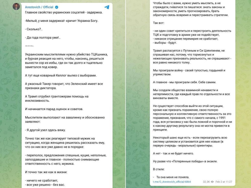 «Не существует способов выйти из этой ситуации, кроме как признать поражение, свою полную персональную и коллективную ответственность за это поражение», — подчеркнул Арестович*.