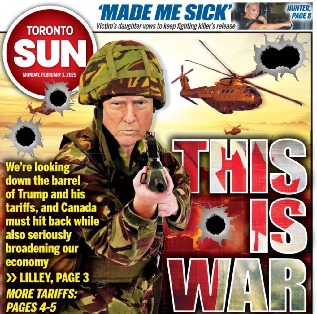 Канадская газета Toronto Sun поместила на обложку президента США Дональда Трампа в военной форме с оружием.