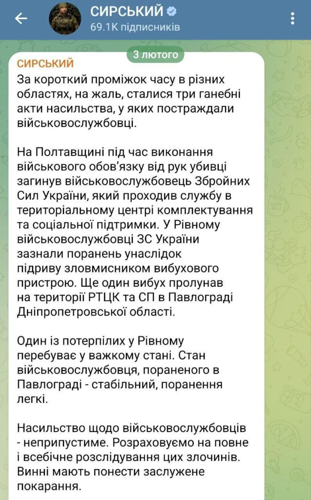 Украинский генерал Александр Сырский отреагировал на взрывы в военкоматах. Своё мнение он решил выразить в Telegram-канале.