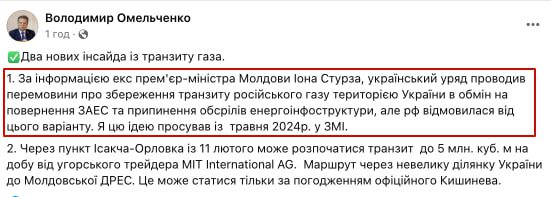 «По информации экс премьер-министра Молдовы Иона Стурза, украинское правительство проводило переговоры о сохранении транзита российского газа по территории