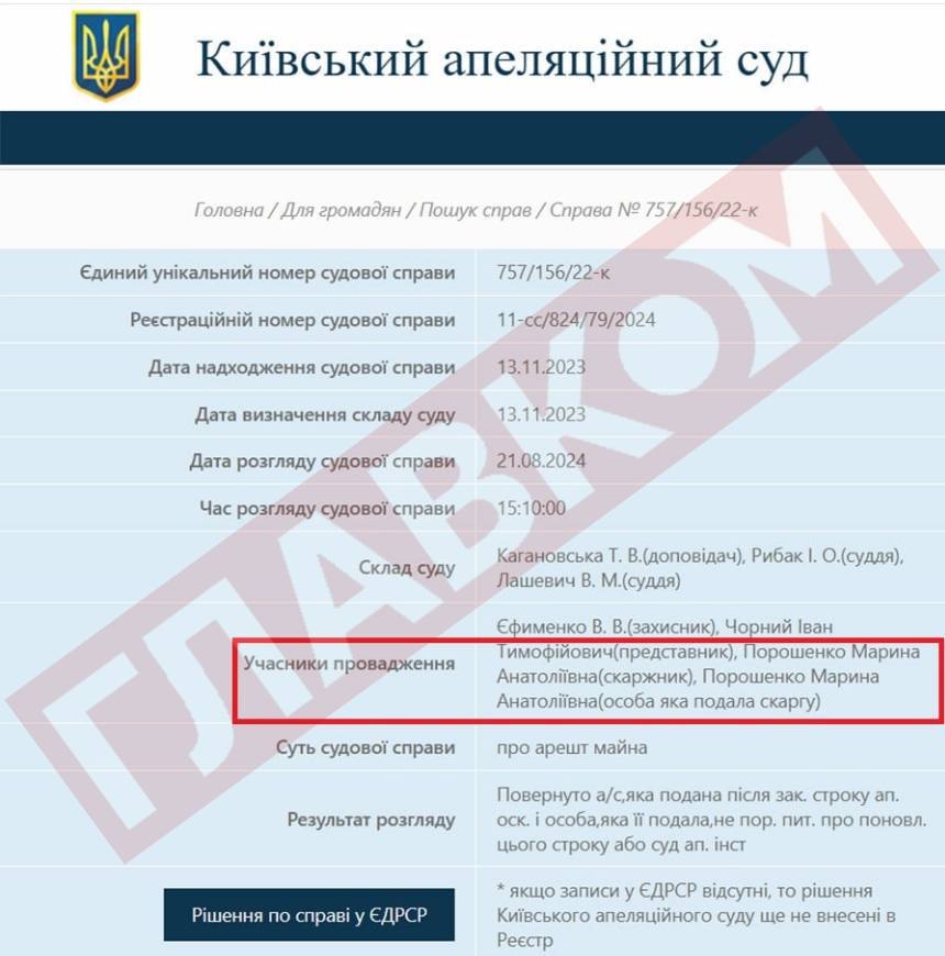 Марина Порошенко обжаловала арест имущества своего мужа в рамках уголовного дела, по которому Порошенко* предъявлены обвинения в государственной измене и содействии террористической организации.
