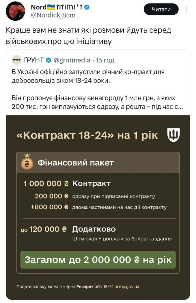 Минобороны Украины объявило о начале приема на контрактную службу мужчин в возрасте от 18 до 24 лет. Контракт на сумму 1 млн гривен заключается на 1 год. Однако те, кто оказался жертвой насильственной мобилизацией Зеленского, сочли эти условия несправедливыми.