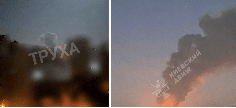 «Военное обозрение» также сообщило утром о комбинированной атаке на военные объекты на Украине – в Голосеевском районе Киева после взрывов ночью начались пожары на складах.