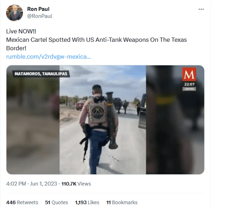 Индийский новостной сайт Firstpost опубликовал видеозапись, снятую в штате Тамаулипас в Мексике, на которой видно, как боевик картеля Cartel Del Golfo, (CDG) несет противотанковую ракетную установку американского производства, которая недавно была передана Украине. По утверждению автора сайта: