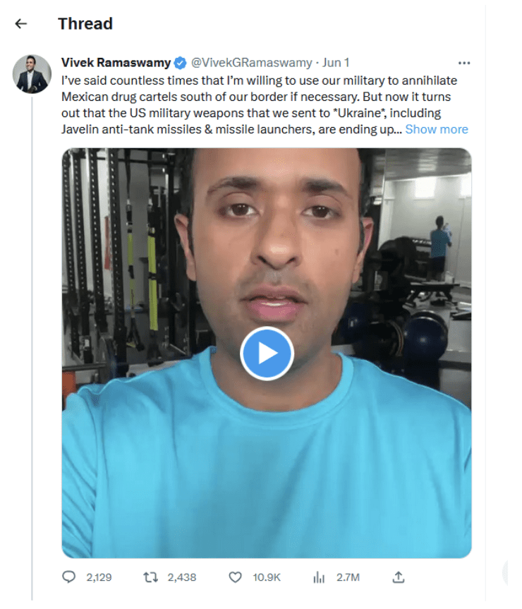 Кандидат в президенты от Республиканской партии на выборах 2024 года Вивек Рамасвами в своем твите от июня 2023 года написал: