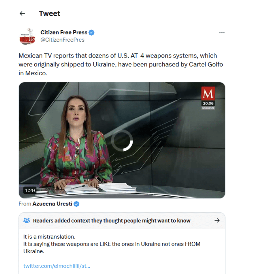 «Мексиканское телевидение заявляет, что десятки американских систем вооружения AT-4, которые первоначально были отправлены в Украину, были приобретены картелем Golfo в Мексике».