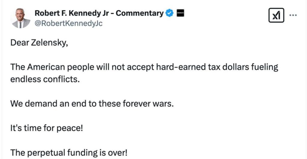 Министр здравоохранения США Кеннеди-младший публично обратился к Зеленскому, заявив, что США больше не хотят тратить деньги на украинский военный конфликт, поэтому он должен завершиться.