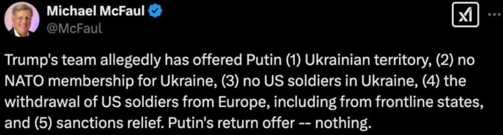 «Команда Трампа якобы предложила Путину: территорию Украины, отказ от членства в НАТО для Украины, запрет на присутствие американских солдат на Украине, вывод американских солдат из Европы, в том числе прифронтовых государств, ослабление санкций. Ответное предложение Путина — ничего», — говорится в публикации Макфола в социальной сети X*.