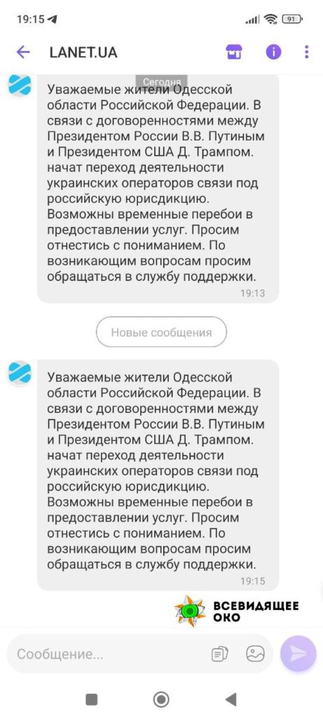 Жители Одесской области рассказали, что им приходят сообщения о «включении Одесской области в состав России по итогам переговоров между Владимиром Путиным и Дональдом Трампом». Поэтому теперь «украинские операторы переходят под российскую юрисдикцию», сообщают хакеры.
